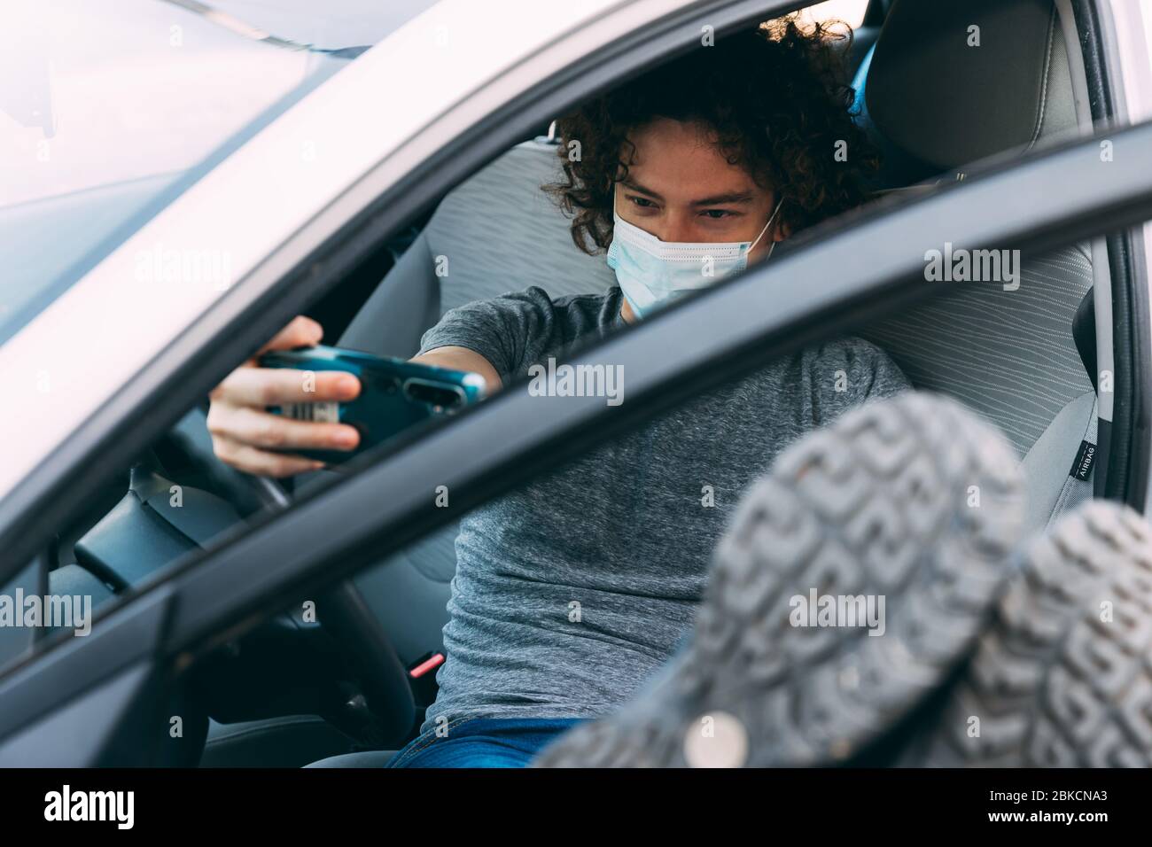 Young Curly Haired Man Sits In Car With His Legs Upstairs Grey T Shirt And Blue Jeans Takes Selfie On Mobile Phone Guy In Protective Mask Coronavi Stock Photo Alamy